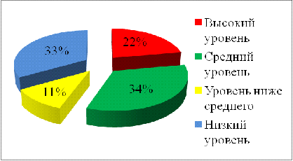 Высокий уровень эмоционального развития 22% (2 воспитанника), средний уровень эмоционального развития 34% (3 воспитанника), уровень эмоционального развития ниже среднего 11% ( 1 воспитанник), низкий уровень эмоционального развития 33% (3 воспитанника).