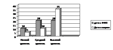 Анализируя данные результаты можно сделать вывод о том, что у детей с ФФНР недостаточно сформировано внимание, сосредоточенность, способность к пониманию, принятию и удержанию задания, а это значит, что уровень самоконтроля у этих детей развит в недостаточной степени для систематического обучения.