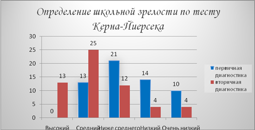 Проведение диагностики уровня школьной зрелости по тесту Керна – Йирасека так же показало успешную динамику. Так низкий уровень опустился до значения с 42% до 1%, а так же появился высокий уровень – 32%.