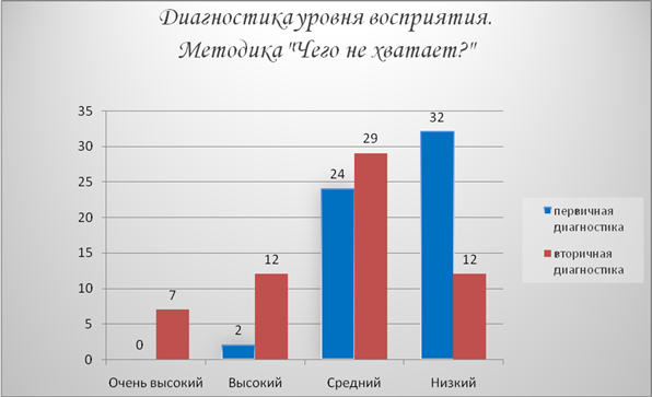 Диагностика уровня восприятия по методике «Чего не хватает?»показало следующую динамику: низкий уровень с 56% до 20%, высокий вырос с 3% до 32%. При этом 7 испытуемых показали очень высокий уровень.