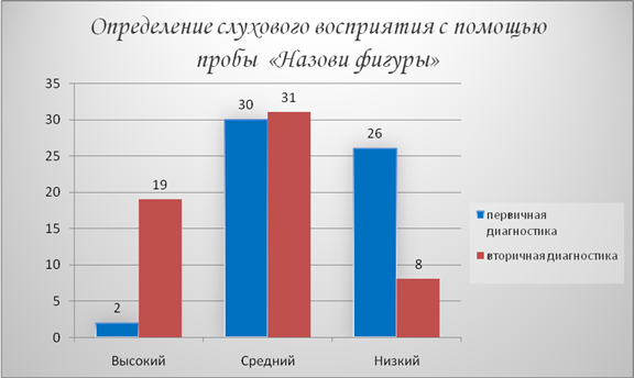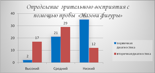 Результаты исследование зрительного восприятия при помощи пробы «Назови фигуры» так показали прогресс: низкий уровень уменьшился с 60% до 21%, а высокий поднялся с 3% до 27%.