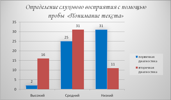 Определение слухового восприятия с помощью пробы «Понимание текста» низкий уровень с 53% до 19%, а высокий – с 3% до 28%;