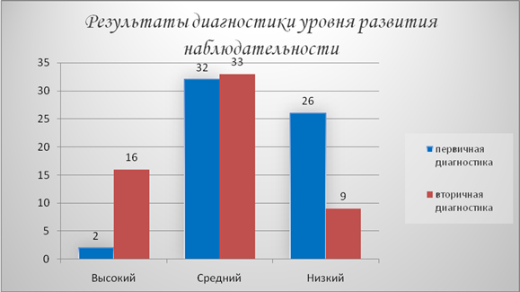 Методика для диагностики уровня развития наблюдательности низкий уровень с 45% до 15%, а высокий – с 0% до 28%;