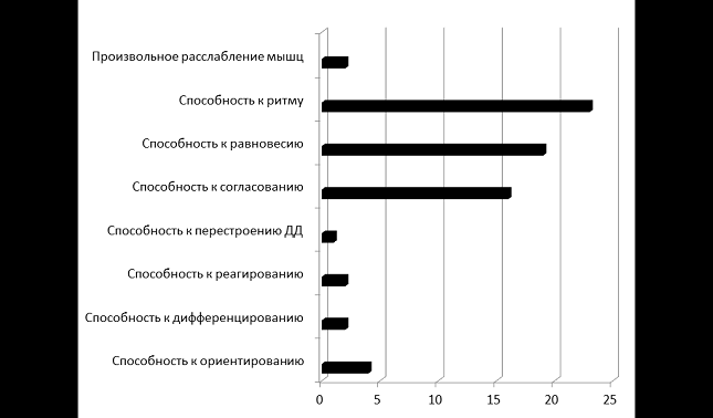 Из схемы, приведённой выше, хорошо видно три вида специфических КС, которым отдали своё предпочтение наибольшее количество респондентов (способность к согласованию - 16; способность к равновесию - 19; способность к ритму - 23). Так же просматривается значительная степень их превалирования над остальными.
