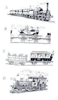 А - экспресс Манчестер-Ливерпуль (кондуктор занимает место кучера); В-открытый вагон 1-го класса;