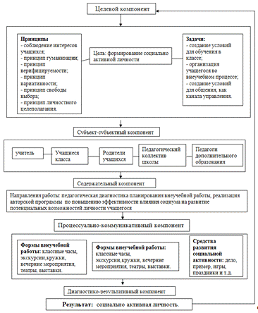 - процессуально-коммуникативный. В этом компоненте описываются формы внеучебной работы, методы для осуществления деятельности и средства развития социальной активности;