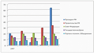 Опираясь на приведенные данные, можно сделать вывод о том, что в целом в период с 1997 по 2000 гг. доверие к президенту стремительно падало, однако после прихода к власти В.В. Путина этот показатель взлетел до отметки 63,5%, также возросло доверие к правительству, относительно без изменений осталось на невысоком уровне доверие к Совету Федерации и Госдуме, уровень доверия к партиям крайне мал и тоже не изменился.