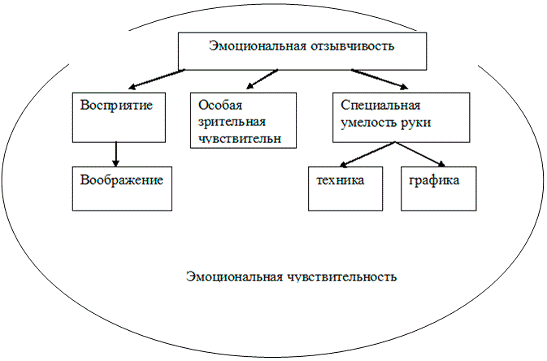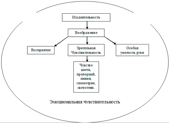 Таким образом, в структуру способностей к изодеятельности дошкольников, по мнению Н.П. Сакулиной, входят в качестве опорных: восприятие, специальная умелость руки, особая зрительная чувствительность. Однако, ведущим компонентом в структуре способностей к изобразительной деятельности, является особая эмоциональная отзывчивость ребенка, которая присуща детям дошкольного возраста и очень ярко проявляется во всех видах творческой деятельности. Следовательно, для ребенка очень важна мотивация, созданная педагогом. Фоновым компонентом в структуре способностей к изобразительной деятельности является эмоциональная чувствительность ребенка (умение восхищаться). Представим вышеизложенное в виде схемы рис 2.