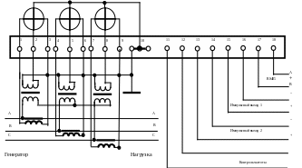 Рисунок 3 Схема подключения счетчика к трехфазной трех проводной линии с помощью трех трансформаторов тока и трех трансформаторов напряжения