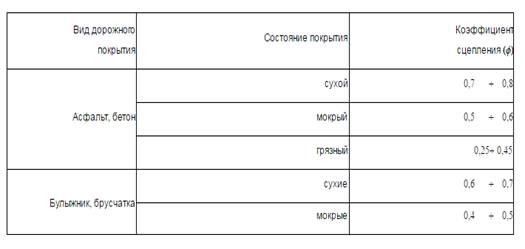Таблица 1 Значения коэффициента сцепления в зависимости от состояния и вида дорожного покрытия