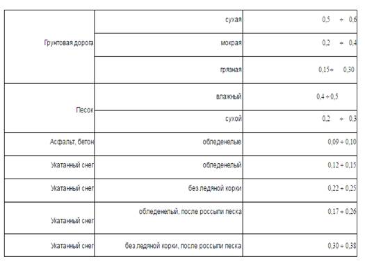 Также существенное влияние на величину коэффициента сцепления оказывают: состояние протекторов шин, давление в шинах, температура окружающей среды и ряд других неподдающихся учету факторов.