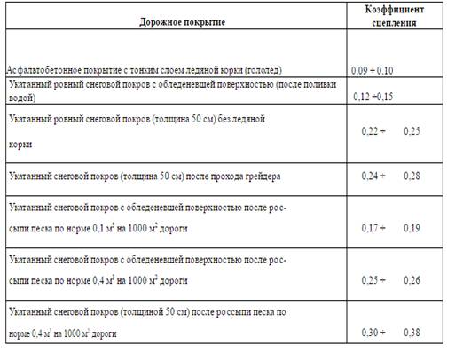 Таблица 2 Коэффициент сцепления в зимних условиях
