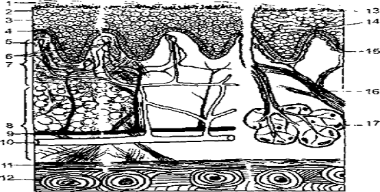 - кератиновый слой; 2 - зернистый слой; 3 ~ шиловидный слой;