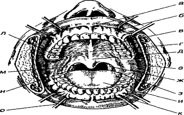 отверстия, м - небная дужка (передняя), н - небная миндалина, о -