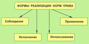 Реализация права состоит из практической реализации нормативных предписаний - запрещения, разрешения, обязывая. Посредством реализации законных норм достигаются цели и результаты законного решения, провозглашенного законодателем в процессе правотворчества.