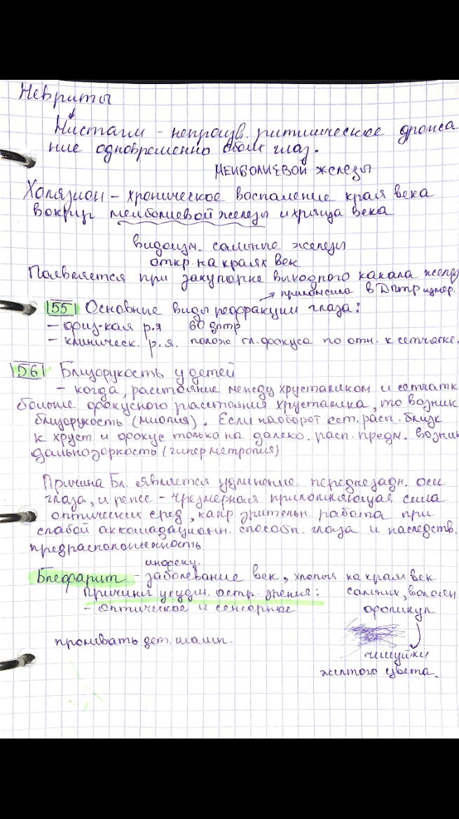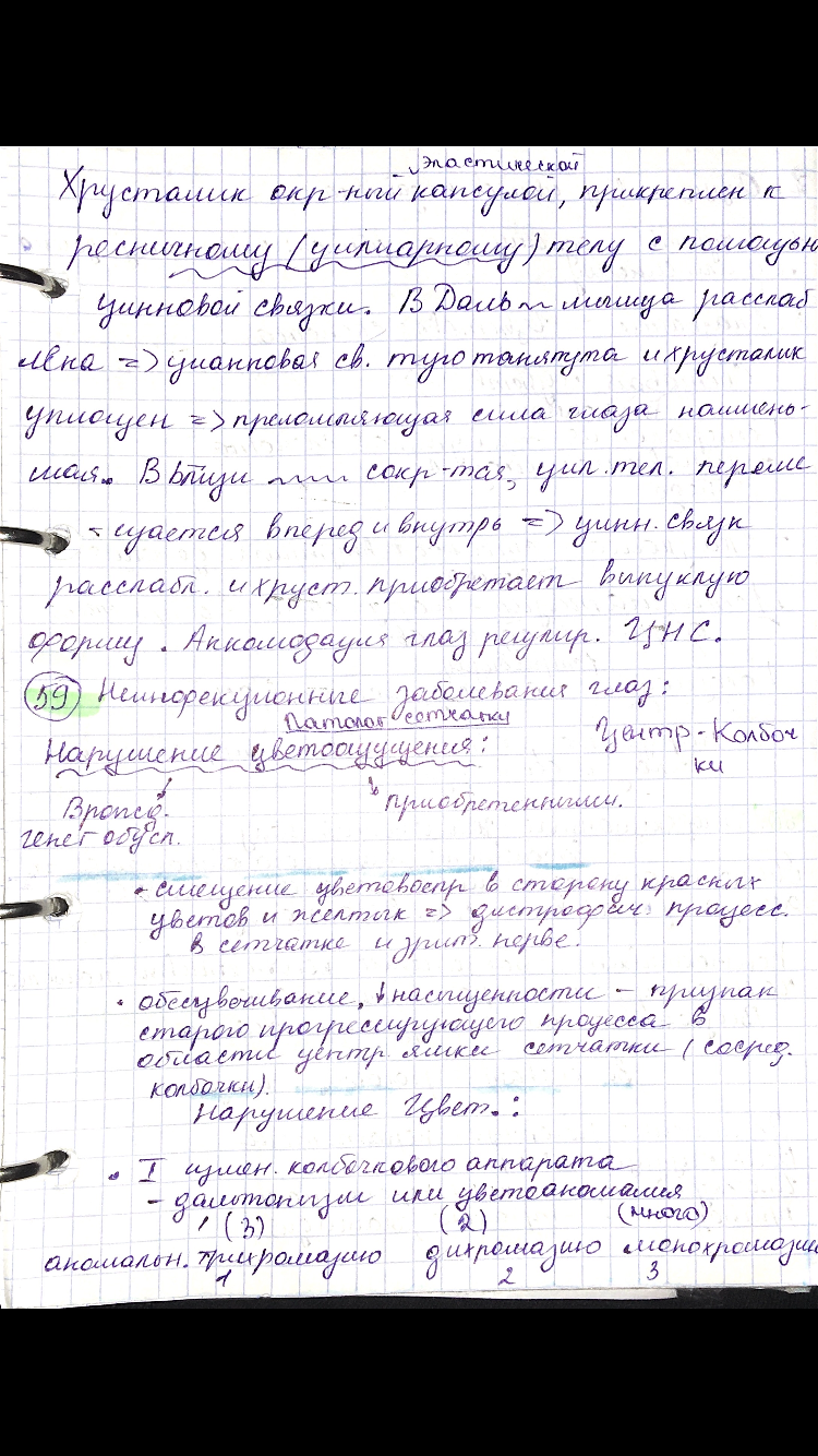 Если расстояние между хрусталиком и сетчаткой больше фокусного расстояния хрусталика, то возникает близорукость (миопия). Если сетчатка расположена слишком близко к хрусталику и фокусирование удается только при рассматривании далеко расположенных предметов, возникает дальнозоркость (гиперметропия). Близорукость и дальнозоркость корректируются очками. Причиной близорукости является удлинение переднезадней оси глаза, и реже — чрезмерная преломляющая сила оптических сред. Способствуют развитию близорукости напряженная зрительная работа при слабой аккомодационной способности глаза и наследственная предрасположенность. При механической слабости склеры происходит постепенное растяжение глазного яблока. Это ведет к патологическим изменениям в сосудистой и сетчатой оболочках наряду с увеличением переднезаднего размера глазного яблока. Определенную роль играют недостаточность мозгового кровообращения при артериальной гипотонии, повышение внутричерепного давления, изменение в шейном отделе позвоночника, воспаление в придаточных пазухах носа. При близорукости зрение вблизи остается хорошим, но ухудшается видимость удаленных объектов. У детей различают две формы близорукости: кажущуюся и простую. Наблюдения за силой или объемом аккомодации показывают, что после рождения ребенка происходит постепенное развитие преломляющей силы, обусловленное возрастом ребенка, особенностями развития и размером глаза, ресничного тела и ресничной мышцы. При кажущейся близорукости ребенок может ясно видеть на расстоянии 4—6 см, т.е. более близком на расстоянии, чем дальнозоркие и взрослые нормально-видящие люди. Такое видение ребенка объясняется большой силой аккомодации, которая может превышать 20 диоптрий (D). Это обусловлено тем, что при сокращении ресничной мышцы хрусталик может принимать почти шарообразную форму. С возрастом ребенка (к полутора годам жизни) переднезадний диаметр глаза увеличивается до 92 %, а к 3 годам достигает 94 % диаметра глаза взрослого человека. К этому сроку уменьшается детская дальнозоркость. Одновременно увеличивается размер глаз и происходит дальнейшее развитие ресничной мышцы и других мышц, а также формируется структура центрального звена зрительного анализатора. Кажущаяся близорукость сохраняется в течение всего дошкольного периода, но подвергается постепенному изменению. В дошкольном периоде при нормальном развитии глаз ребенок, рассматривая рисунки или выполняя их, может склоняться так близко к рисунку, что это можно ошибочно принять за близорукость. Однако это кажущаяся близорукость, и она не требует коррекции очками. Даже у ряда детей 7-летнего возраста расстояние до точки ясного видения может не превышать 6 — 7 см. Простая близорукость развивается чаще у ослабленных детей после трех лет.