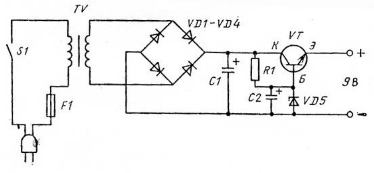 Регулирующий транзистор VT включен последовательно между выходом выпрямителя и положительным полюсом источника напряжения. Стабилитрон VD5 определяет потенциал базы транзистора VT относительно отрицательного полюса источника питания, а тем самым и значение выходного напряжения, так как положительное смещение между базой и эмиттером транзистора VT относительно мало.