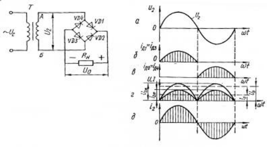 б) двухполупериодные, в которых ток проходит через вентиль в течение обоих полупериодов;