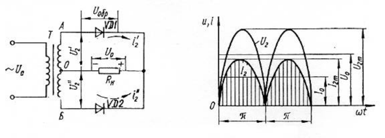 Рисунок 2 - Схема двухполуперионого выпрямителя со средней точкой, график токов и напряжений