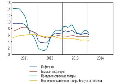В целом за 2013 г. по сравнению с 2012 г. инфляция замедлилась на 0,1 процентного пункта. Заметным было снижение темпов роста цен на непродовольственные товары - на 0,7 процентного пункта. Понизилась базовая инфляция - на 0,2 процентного пункта. Это указывает на то, что совокупное влияние фундаментальных факторов на ценовую динамику в экономике являлось в целом сдерживающим.