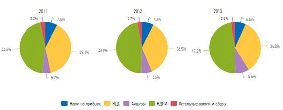 Рис. 3. Структура поступлений налогов в бюджет Российской Федерации за