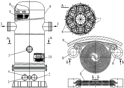 воды; 7 - колонны греющих змеевиков; 8 - горизонтальные спиральные змеевики; 9