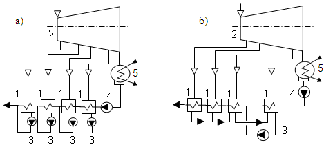 с дренажными насосами у каждого подогревателя; б) - с каскадным сливом дренажей
