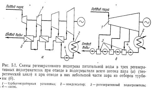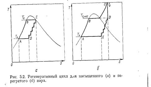 На паротурбинных установках электростанций, работающих на органическом топливе, применяют только перегретый пар; в атомной энергетике широко используют также насыщенный пар. Поэтому рассмотрим паровой цикл с регенеративным подогревом питательной воды для обоих этих случаев.