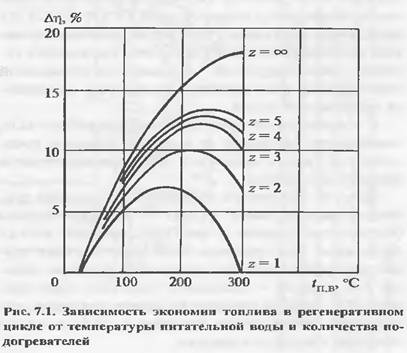 На рис. 7.1 показана зависимость экономии топлива в регенеративном цикле без промежуточного подогрева пара по сравнению с циклом Ренкина от tпв и количества подогревателей z при начальном давлении 8,6 МПа, которому соответствует температура насыщения t s0 =3000C. Видно, что с установкой каждого следующего РП относительный выигрыш в экономии топлива уменьшается. Поэтому количество РП обычно не превосходит 7-9.