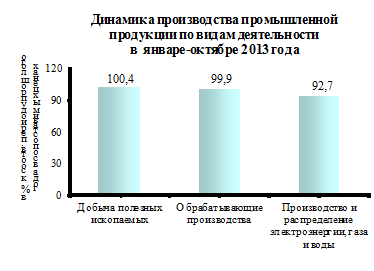 За январь-октябрь 2013 года индекс производства по основным видам деятельности по полному кругу организаций-производителей составил 99,5% к январю-октябрю 2012 года. Это обусловлено снижением индекса в обрабатывающих производствах - 99,9%, оказывающих наибольшее влияние на динамику индекса производства в целом, а также производстве и распределении электроэнергии, газа и воды - 92,7%. В добыче полезных ископаемых индекс производства составил100,4% к январю-октябрю 2012 года.