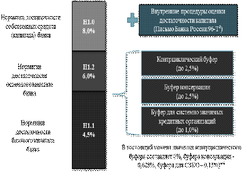 Для каждого из компонентов капитала установлено минимально допустимое значение по отношению к активам банка, взвешенным по риску (Рисунок 2). Кроме того, Базель III предусматривает создание буферов капитала (в российской практике - надбавок к достаточности капитала): консервации, контрциклического и буфера для системно значимых кредитных организаций. Указанные надбавки не входят в состав нормативов достаточности капитала, они представляют собой дополнительные требования.