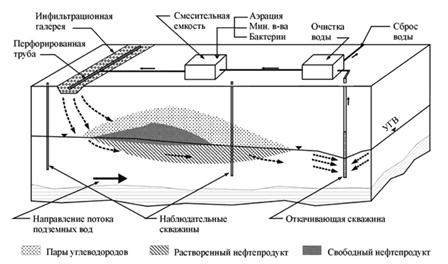 При сильном загрязнении сооружают инженерно-экологические системы. Создание таких системы обусловлено высокой подвижностью нефтепродуктов в компонентах геосистем, особенно при длительном загрязнении почв, и образованием больших ареалов свободных и связанных нефтепродуктов на границе раздела зоны аэрации и подземных вод. Подобные антропогенные залежи нефтепродуктов формируются вблизи складов топливно-смазочных материалов, нефтебаз и нефтеперерабатывающих заводов. Они вызывает опасность загрязнения не только почв но и подземных и поверхностных вод. Поэтому задачами инженерно-экологической системы являются удаление подвижных нефтепродуктов, рекультивация почв, защита рек и водозаборов от загрязнения нефтепродуктами с одновременной локализацией очагов загрязнения [4, с. 60-61].