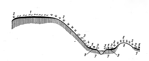 Преобладающие виды: 1 - багульник, 2 - карликовая береза, 3 - карликовая ива, 4 - луговые злаки, 5 - осоки, 6 - лишайники. Грунты: 7 - глинистые, 8 - песчаные, 9 - торфяные