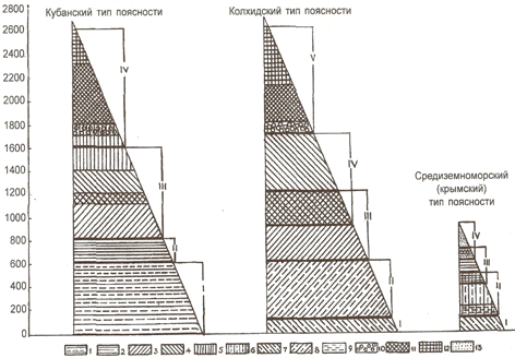 1 - лесостепь; 2 - дубовые леса; 3 - буковые леса; 4 - буково-пихтовые леса; 6 - дубовые леса; 7 - пояс литоральной растительности; 8 - субтропические колхидские леса; 9 - сосновые леса; 10 - субальпийское криволесье; 11 - субальпийские луга; 12 - альпийские луга; 13 - пояс горных степей.
