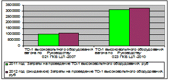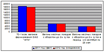Факт 2011 года и ожидаемый объем 2012 года отправленных вагонов по вышеперечисленным составам составляет соответственно 6042 вагона для 2011 года и 5861 вагон для 2012 года. Из них в период использования высоковольтного оборудования вагонов с 5 сентября по 15 мая ТО-1 высоковольтному оборудованию произведено в количестве 3974 в 2011 году и ожидаемое количество ТО-1 в количестве 3855 в 2012 году.