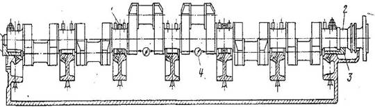 У большинства двигателей можно проверить ось коленчатого вала, т.е. определить наличие возможного упругого прогиба его в процессе эксплуатации судна. В этом случае задача сводится к определению положения рамовых подшипников коленчатого вала, т.е. к определению просадок рамовых подшипников. Тем самым учитывается, что одна только проверка прилегания вала к рамовым подшипникам не дает еще основания считать, что вал равномерно нагружает все подшипники. Он, находясь даже под статическим действием одних сил собственного веса, может прогибаться так, что не будет касаться всех рамовых подшипников. Поэтому правильнее считать, что упругий прогиб коленчатого вала определяется величиной просадок его рамовых подшипников и шеек и тем самым, будет зависеть от износа последних.