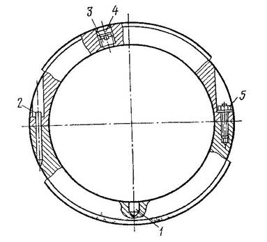 Половинки колец фиксируются призонными штифтами 2. Наружный диаметр кольца равен диаметру постели рамы с учетом зазора на скользящую посадку, а внутренний диаметр несколько больше диаметра соответствующей рамовой шейки. Для регулирования положения кольца относительно шейки в него ввернуты регулировочные винты 3 и 4.
