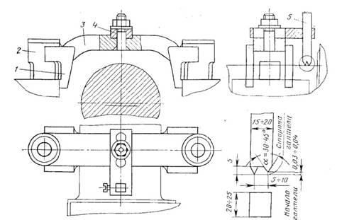 Резец, закрепляемый в приспособлении, имеет две режущие кромки; одна наносит риску в начале галтели, а вторая - на рабочей части шейки на расстоянии 5 - 10 мм от первой. Поворотом коленчатого вала шейка устанавливается наибольшей выработкой вверх. Резец закрепляют в приспособлении так, чтобы он касался режущими кромками поверхности шейки, и проворачивают вал 2 - 3 раза. На поверхности шейки образуются две четкие риски, наибольшая глубина которых в зависимости от эллиптичности может быть 0,3 - 0,6 мм.