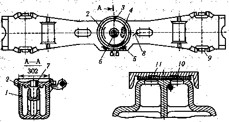При обследованиях надрессорных балок установлено, что глубина износов опорных поверхностей подпятников 4, упорных поверхностей наружных 5 и внутренних 6 буртов резко возросли. Это происходит из-за увеличения интенсивности перемещений пятника по подпятнику