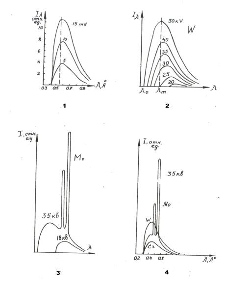 При дальнейшем увеличении напряжения спектр может измениться радикальным образом (рисунок 5): на фоне непрерывного спектра появляются интенсивные, острые линии так называемого "характеристического" излучения. Напряжение, которое необходимо подать на трубку для того, чтобы получить линии характеристического излучения, называет потенциалом возбуждения данной линии.