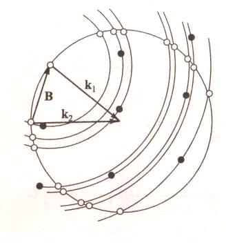 Черные точки - узлы обратной решетки при неподвижном кристалле светлые точки-узлы обратной решетки при их попадании на сферу Эвальда во время вращения кристалла