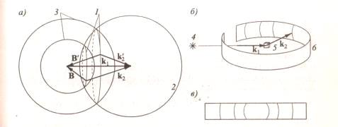 а - построение Эвальда; 1 - линии пересечения сферы Эвальда 2 со сферами 3, на которых лежат начальные точки векторов В обратной решетки; б - схема эксперимента: 4 - источник излучения (рентгеновская трубка), 5 - образец, 6 - фотопленка; в - развернутая пленка