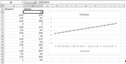 ) Составляем таблицу данных для прямой. Вносим в первую колонку значения аргумента из данного диапазона, используя автозаполнение. Во вторую колонку вносим уравнение: =(3/5)*A2+3 и используем автозаполнение.