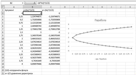 ) Составляем таблицу данных для параболы. Вносим в первую колонку значения аргумента из данного диапазона, используя автозаполнение. Во вторую колонку вносим уравнение: =(6*A2)^(1/2),в третью колонку вносим уравнение: =-((6*A2)^(1/2)) и используем автозаполнение.
