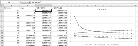 ) Составляем таблицу данных. Вносим в первую колонку значения аргумента из данного диапазона, используя автозаполнение. Во вторую колонку вносим уравнение: =2/A2 , в третью колонку вносим уравнение: =(2*A2)^(1/2),в четвёртую колонку вносим уравнение:=-((2*A2)^(1/2)) и используем автозаполнение.