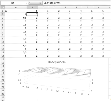 ) Составляем таблицу данных для плоскости. Вносим в первую колонку значения переменной x из данного диапазона, используя автозаполнение. Таким же образом по горизонтали в первый ряд вносим значения переменной y. Во вторую колонку вводим формулу: =2-0*$A2-0*B$1и при помощи автозаполнения заполняем остальные колонки.