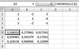 ) На панели инструментов выбираем "Вставить функцию", в диалоговом окне выбираем тип функции "МОБР". В поле "Массив " вписываем диапазон матрицы Aи нажимаем сочетание клавиш Ctrl+Shift+Enter.