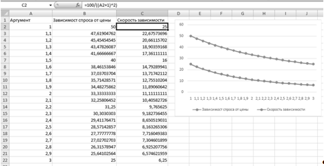 ) Составляем таблицу данных для обеих функций. Вносим в первую колонку значения аргумента из данного диапазона, используя автозаполнение. Во вторую колонку вводим формулу: =100/(A2+1) , в третью колонку вводим формулу: =100/((A2+1)^2) и используем автозаполнение.