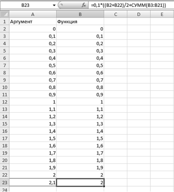 ) Для вычисления интеграла методом треугольников вводим в свободную ячейку формулу: =0,1*СУММ(B3:B22).Полученный результат будет приблизительным значением интеграла.