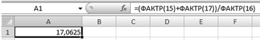 ) Для вычисления воспользуемся функцией "ФАКТР". В свободную ячейку вводим формулу: =(ФАКТР(15)+ФАКТР(17))/ФАКТР(16).